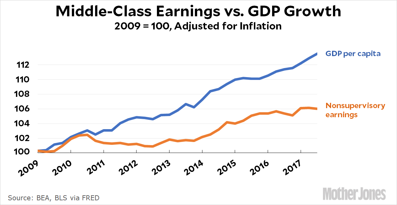 GDP per capita has gone up 1.5 percent per year since 2009, accelerating to 2 percent over the past year. That’s not bad. America is getting richer, and over the past year has gotten richer at a faster pace.