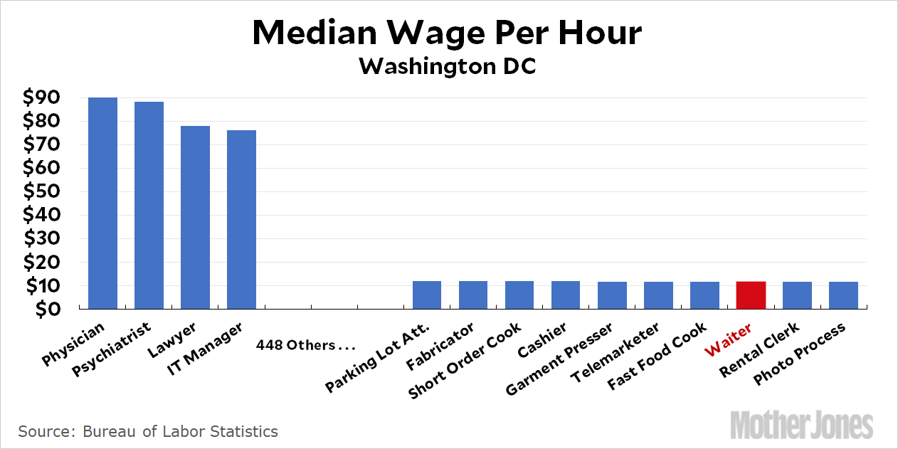 Yesterday I ran across a piece at the Intercept about a campaign to raise the minimum wage for tipped workers in Washington DC. It currently stands at a mere $3.33, which is justified by the belief that waiters and waitresses are able to make up for this low minimum wage via tips. But this got me curious. Counting all those tips, how much do waiters in Washington DC make? Luckily, the Bureau of Labor Statistics provides the median wage in DC for 462 different occupations: