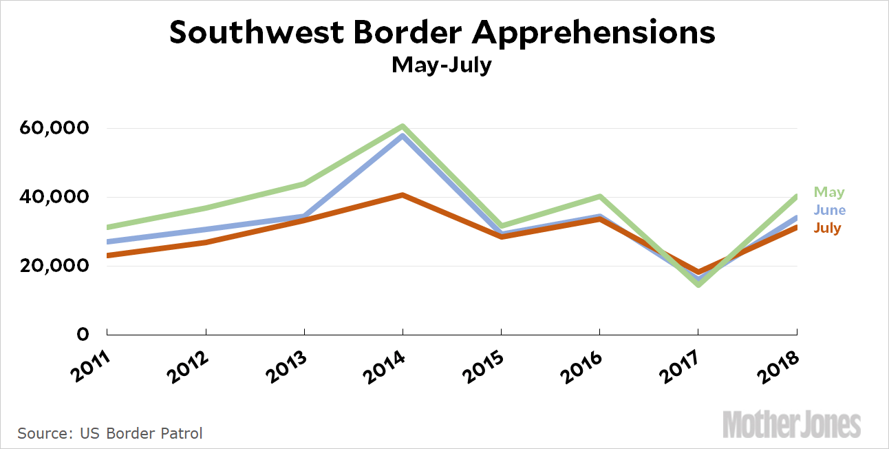 Poor Donald. Lots of yelling and screaming, lots of ICE abuse, and even a politically disastrous effort to rip families apart at the border. But has it done him any good? According to the latest numbers from CBP, no. Summer border crossing activity is down a bit as usual, but it’s still higher than it was during the Obama era. Apparently roaring and blustering and promoting inhumane policies haven’t gotten him anywhere. Maybe it’s time for a different strategy?