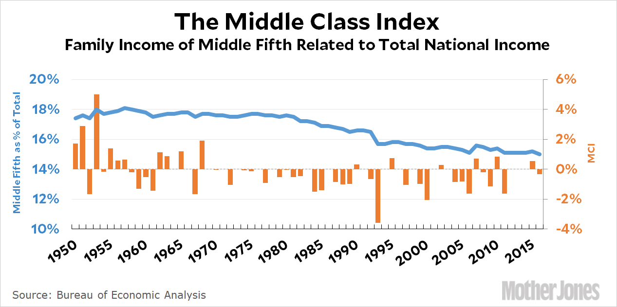 That’s where the orange bars come in. This is my patented Middle Class Index, and I’ll be the first to concede that it’s pretty arbitrary: it’s just the change in the share of income going to the middle fifth multiplied by the change in real national income times a special constant.¹ It only goes up if both are going up, and it goes up more if either one goes up more. I’ll leave it to real economists to come up with something better, but this at least provides a general sense of how things are going.