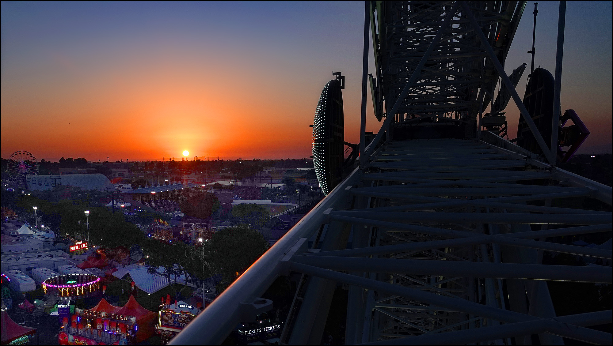 Here’s a picture of sunset at the Orange County Fair as seen from La Grande XL, “quite possibly the largest traveling observation wheel in the Western Hemisphere.” Hmmm. “Quite possibly”? Sounds like someone better get cracking on La Grande XXL.