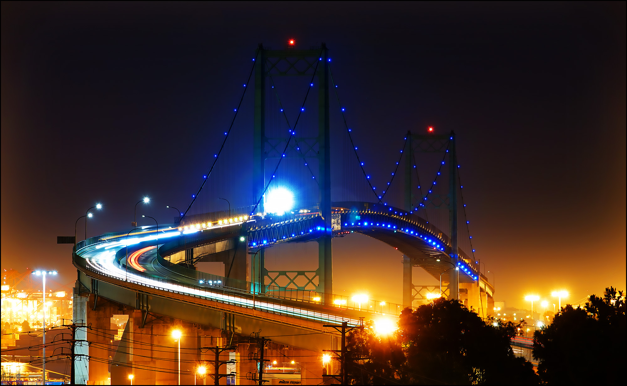 As it turns out, I just wasn’t patient enough. The bridge is lighted, but not until it gets a little darker. So here’s a picture of the Vincent Thomas Bridge at night, nestled above the always bright and busy lights of the Port of Los Angeles.