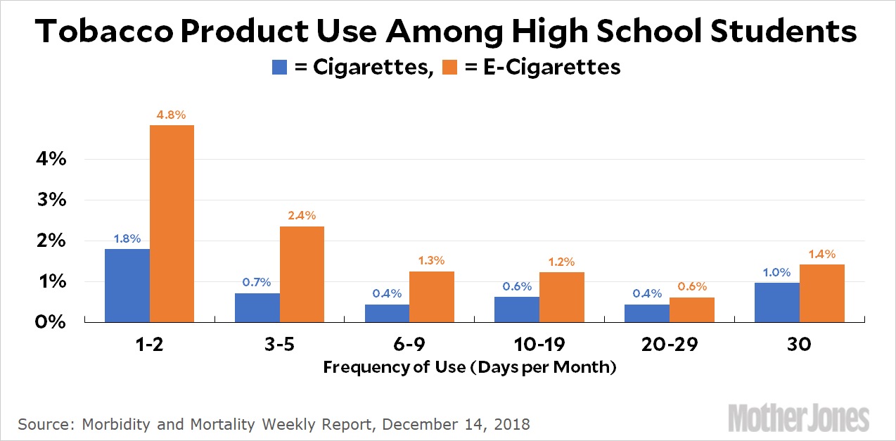There are two things missing from this. First, it’s an average of 2015-2017. We know that vaping has been on the rise, so this probably underestimates e-cigarette use somewhat. Second, it doesn’t distinguish between nicotine and non-nicotine vaping. At a guess, non-nicotine vaping dominates the 1-10 day categories, but nicotine vaping dominates the 10-30 day categories. Also note that the raw data used in this report shows these categories as a percent of people who use the products. I converted this into total use assuming that 5 percent of high school students use cigarettes (cited here) and 11.7 percent use e-cigarettes (cited in the first paragraph of the MMWR report).
