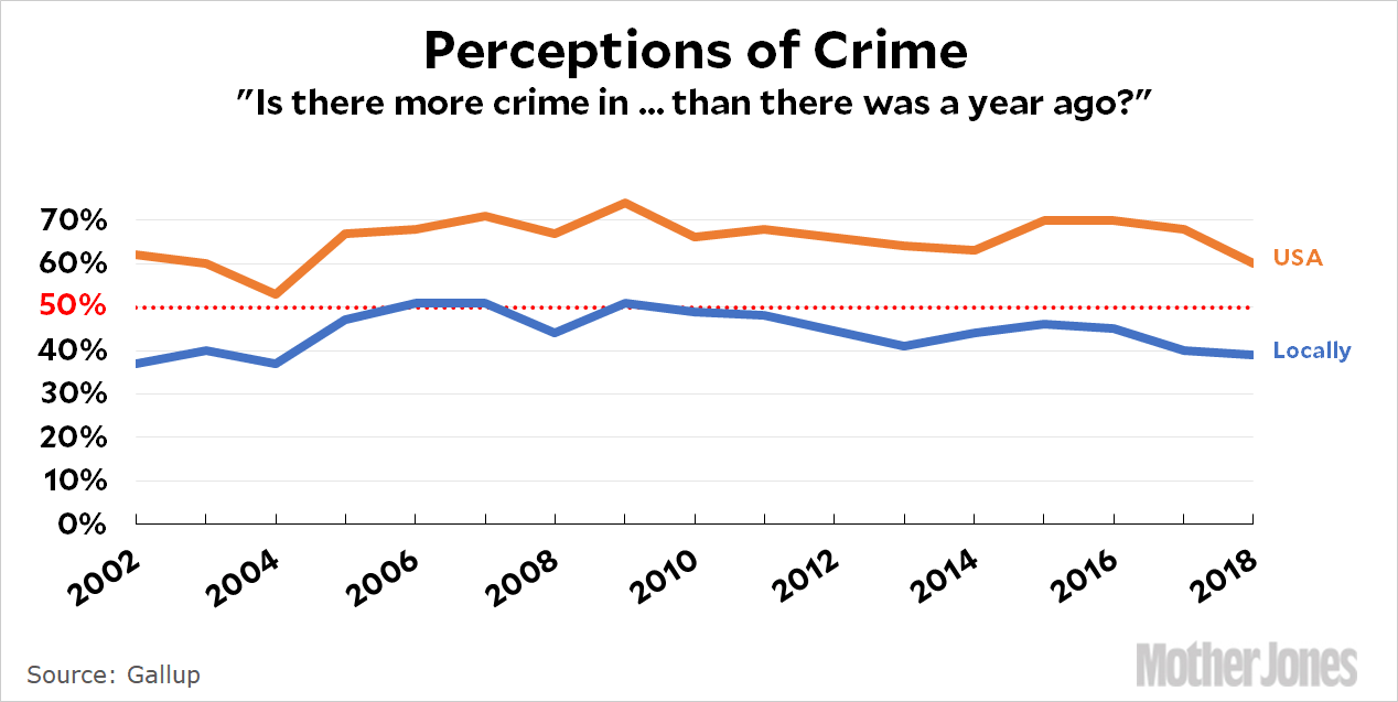 These two trendlines track each other quite closely, but the USA line is consistently about 25 percentage points higher. In other words, if you ask people about crime in their own neighborhoods, fewer than half think it’s going up. But if you ask them about crime in the whole country, 60-70 percent think it’s going up.
