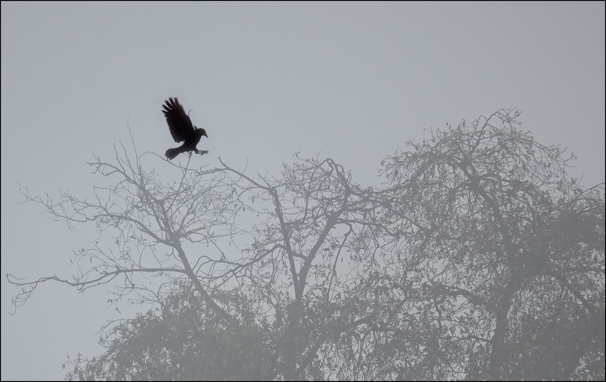 You’ve heard of the lion in winter? This is a crow in winter. Or at least a crow in moderate morning fog, which is the closest thing we get to winter here in Southern California. I wish this were a more impressive bird, like a raven or a mutant condor or something, but no. It’s just a common crow. So boring.