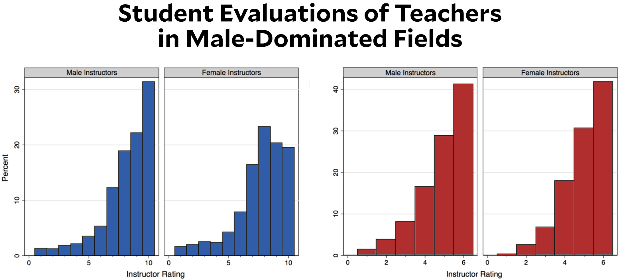 This is exactly what it looks like. A large research university decided to switch its teaching evaluation surveys from a 10-point scale to a 6-point scale. In most fields, this made little difference. But in fields that are traditionally male-dominated, the enormous gender gap in evaluations disappeared. Why?