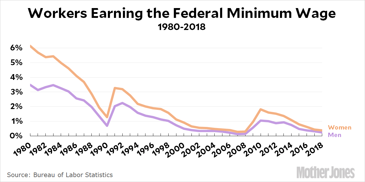 The federal minimum wage has declined so much that it barely even matters anymore. Even at the height of the Great Recession, only 1 percent of employed men and 2 percent of employed women worked for the minimum wage. Today the figures are 0.23 percent and 0.37 percent.