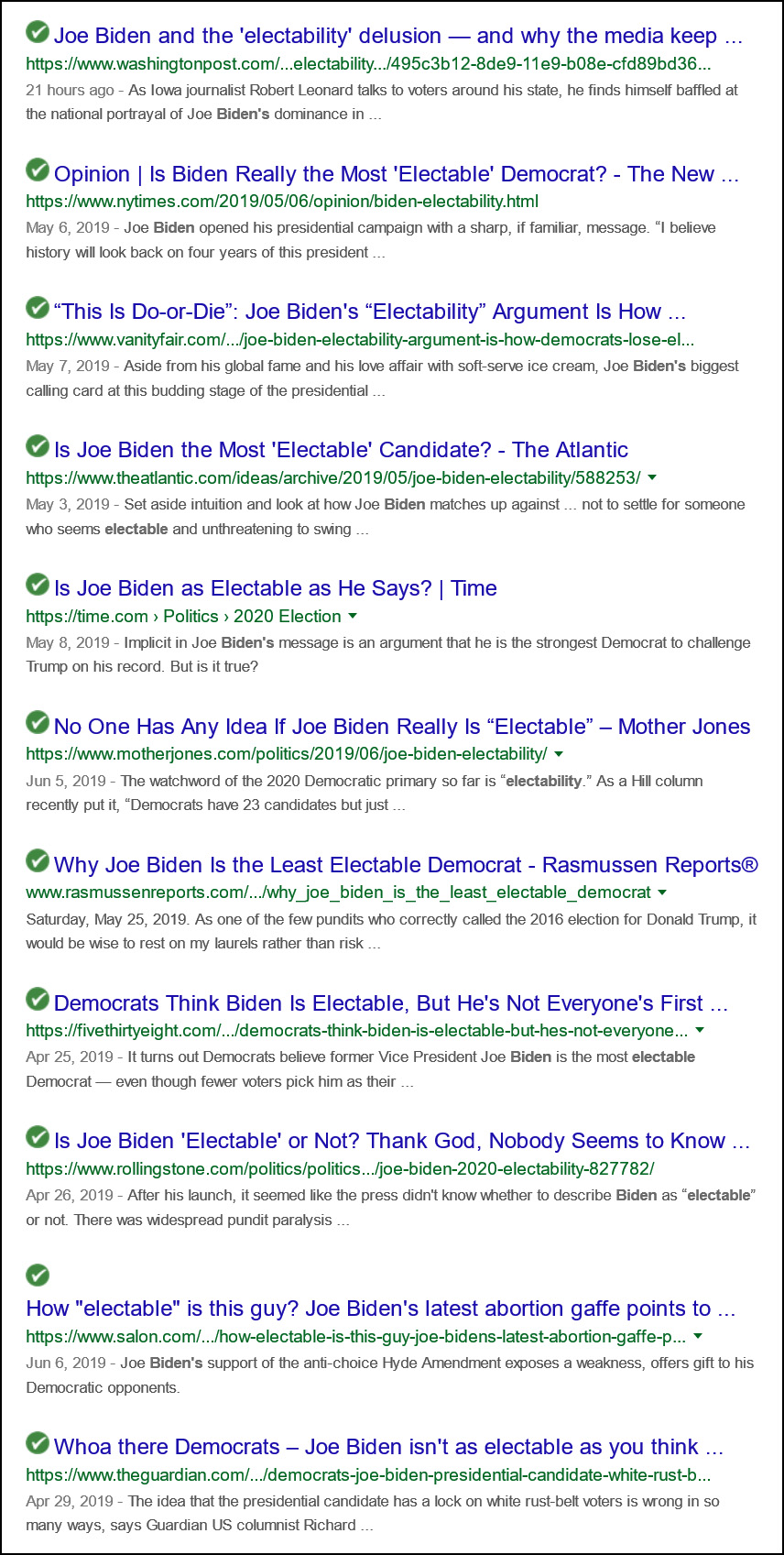 I’m pretty sure I’ve read at least a dozen pieces complaining about Biden’s supposed electability for every piece that actually says Biden is the most electable candidate. In fact, let’s check that out. Here are the top results from a Google search for “Biden electable”: