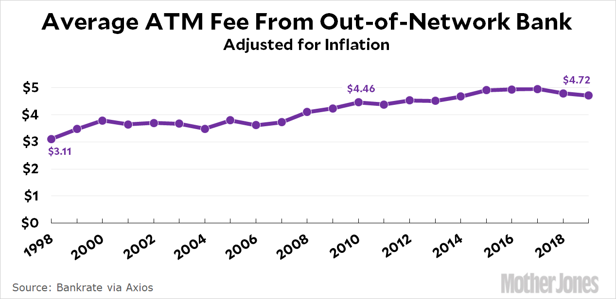 Axios published a chart today showing the evolution of ATM fees since 1998 and it’s been making the rounds. What do I have to contribute to this? Just the usual: adjusting it for inflation since it’s a time series of money. Here’s the real average ATM fee over the past couple of decades:
