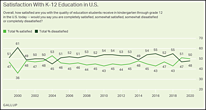 In summary: graduation rates are up; reading and math scores are up, violent behavior on campus is down, and satisfaction with K-12 education has stayed steady for the past two decades. And in case you’re curious, the US ranks about average among all countries for bullying.