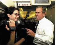 The other reporters may crack caustic jokes about Bush’s snowmobile-riding photo ops — in private — but when the candidate shifts to an even mildly serious discussion, their faces are stern and their tape recorders are rolling. And no wonder: Their future jobs in the White House press corps hinge on his success. As Bush informs the filmmaker, “If I lose, you’re out of work, baby. You’re off the plane, baby.”