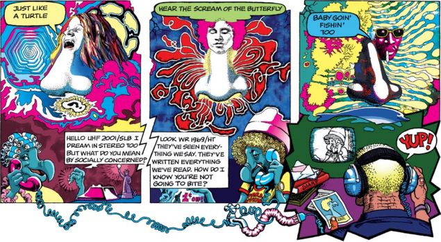 Detail from “Terry the Turgid Toad and His Sidekick Cosmic Dog in ‘Weird Trip,'” by Denis Kitchen. Another mindbender; in this one, a dog and a toad read about Timothy Leary and decide to drop acid. Kitchen is a prolific comic artist, publisher, and author, who founded Kitchen Sink Press, Denis Kitchen Publishing Co., and the Comic Book Legal Defense Fund.