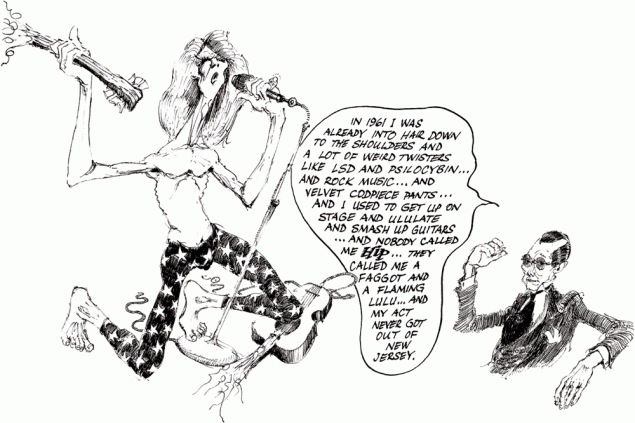 Detail from “The Man Who Peaked Too Soon,” text and art by Tom Wolfe. Better known for his role in the development of the New Journalism in the early ’60s and his many fiction and nonfiction books, Wolfe demonstrates here that he could also have had a career as a comics artist, while narrating the story of a man who garners nothing but abuse by anticipating some of the major trends of the ’60s and ’70s just a little too early.