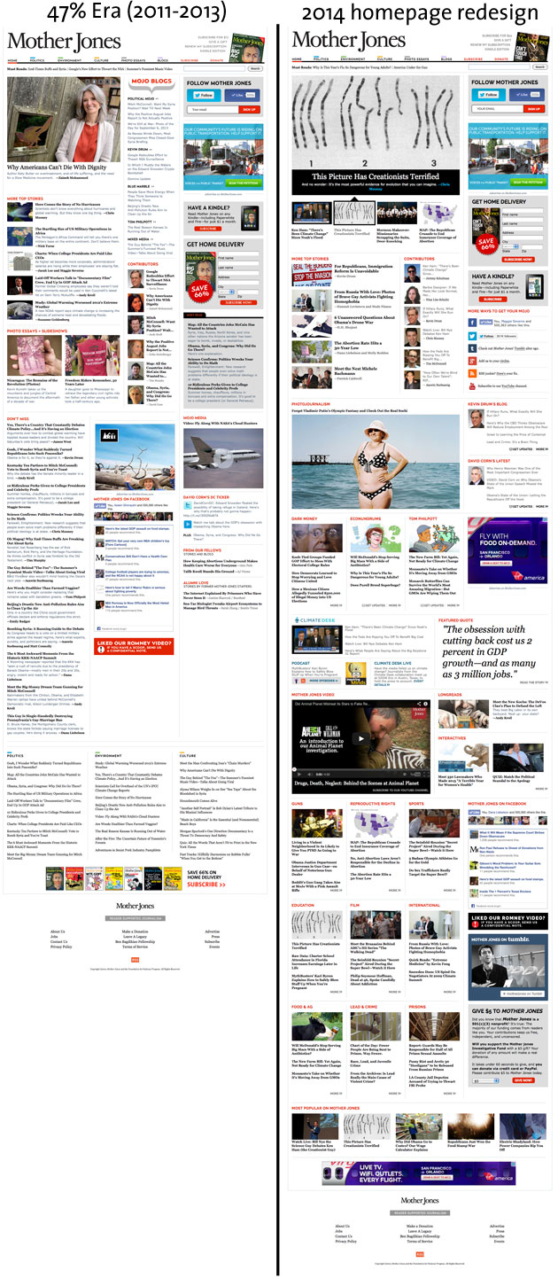 Close observers of online media are well aware that homepages just don’t matter as much as they used to. Facebook and Twitter send us enormous amounts of traffic, and all those folks skip over the landing pages and go directly to the stories. Nevertheless, 1 out of every 6 pageviews to the desktop version of MotherJones.com is to the homepage. It’s still important.