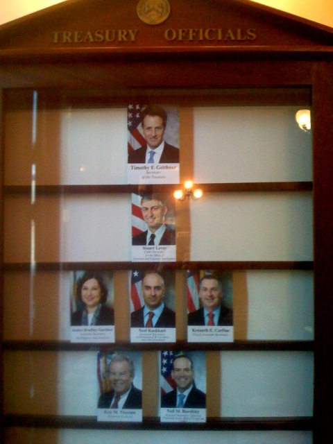 On Monday, after Treasury Secretary Timothy Geithner finished briefing reporters on the administration’s new toxic assets plan, journalists filed out of the Treasury building–which conveniently and symbolically sits next to the White House on Pennsylvania Avenue–and spotted something interesting in the lobby: a case that holds the photographs of the Treasury Department’s top officials. And the case looked rather empty.