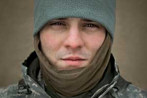 PRAY AND I DRIVE through a bleak landscape of fallow winter fields and strip malls in his blue Dodge Stratus as Drowning Pool’s “Bodies”—a heavy metal song once used to torment Abu Ghraib detainees—plays on the stereo. Clad in an oversize black hoodie that hides his military physique, Pray sports an Army-issue buzz cut and is seriously inked (skulls, smoke, an eagle). His father kicked him out of the house at age 14. Two years later, after working jobs from construction to plumbing—”If it’s blue collar, I’ve done it”—he tried to enlist. It wasn’t long after 9/11, and he was hell-bent on revenge. The Army turned him down. Blaming the “THOR” tattooed across his fist, Pray tried to burn it off. On September 11, 2006, he approached the Army again and was accepted.