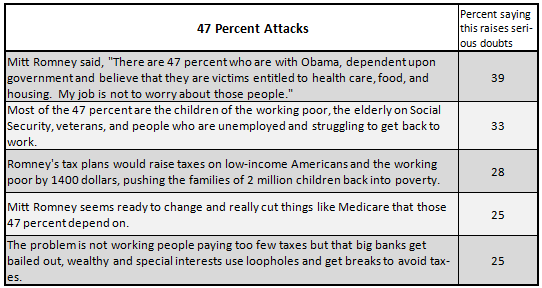 Voters were asked which of a series of attacks raised the most doubts in their mind about Mitt Romney. The strongest—Mitt Romney’s 47 percent quote—raised serious doubts for four in ten voters and the fact that many of the so-called ‘47 percent’ are veterans, seniors, and the children of the working poor raised serious doubts for a third.