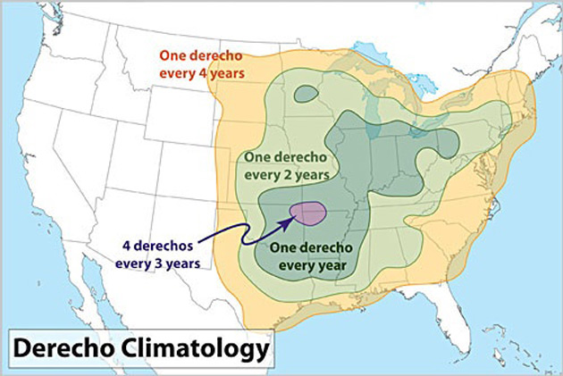 Is it like a tornado? Not exactly. The two types of storms can occur in the same system, but the damage of a derecho is directed along a fairly straight path and tornadoes are more isolated events. “A tornado, when it does occur, may be on the magnitude of a mile or two wide; a derecho could go for hundreds of miles producing significant damage,” Jim Keeney, weather program manager at the national weather service’s office in Kansas City, Mo., told CBS.