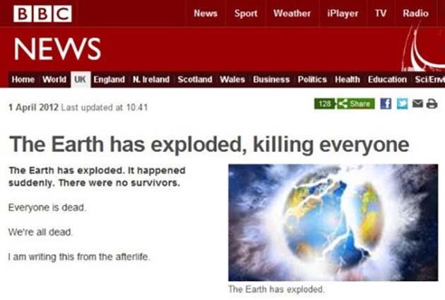 In 2012, this image made the rounds on the internet purporting to show how the BBC “won April Fools” with a great prank. (For some reason many news organizations prank their readers on April 1.) But it was not the case. It was actually a joke created by writer Greg Stekelman.
