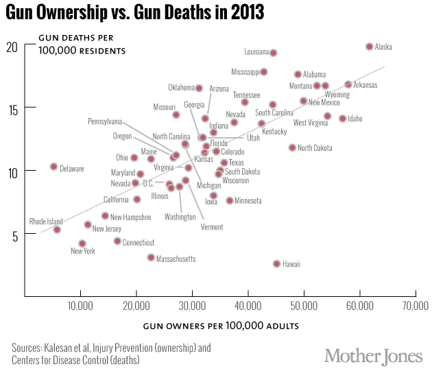 Gun deaths result not only in unquantifiable emotional trauma on families and communities, but they’re also associated with higher financial costs. As Mother Jones found in this recent investigation, gun violence cost Americans a whopping $229 billion in 2012. That comes out to more than $1,000 per resident in states with high rates of gun ownership and gun deaths, such as Louisiana, Wyoming, and Alaska.