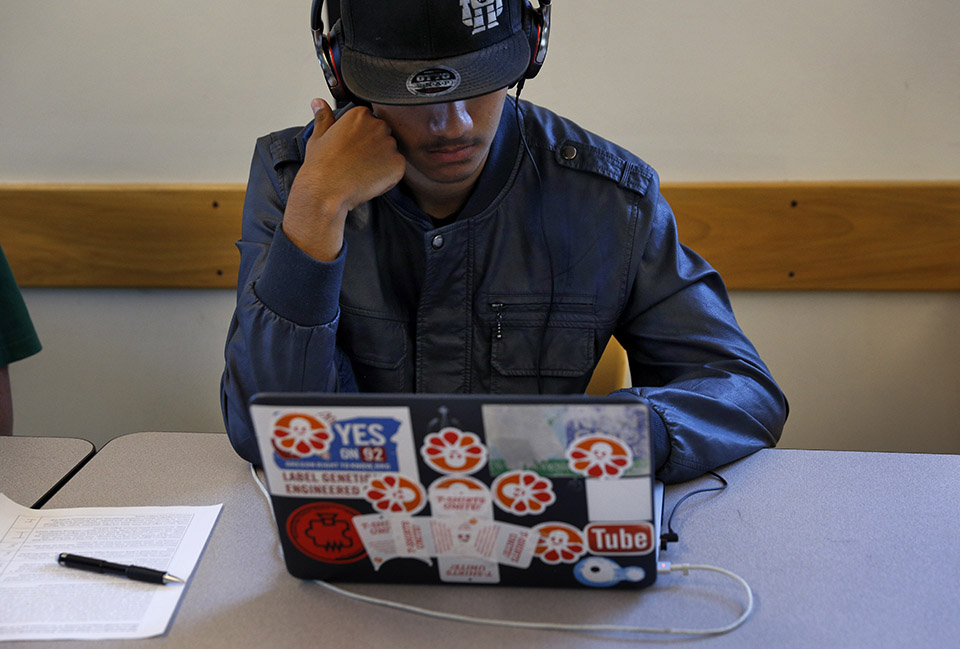 Jenny Macho helps student James Poe during AP English Literature class at Summit Everest Public High School in Redwood City, Calif., Thursday, October 26, 2017. The charter school network is at the forefront of personalized learning and incorporating technology.