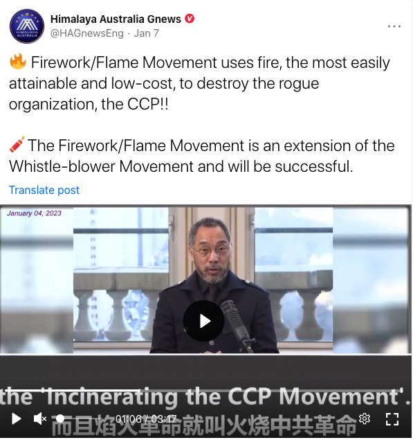 In a January 4 video that also appeared on Gettr, Guo urged supporters to use the Chinese New Year, which is often celebrated with fireworks, as an excuse to start fires to “destroy the rogue organization, the CCP.” Guo referred to this push as “the firework/flame movement” and “the incinerating the CCP movement.” He added: “The ordinary people have one key weapon, which is fire. As long as there is fire, cars, gasoline, fireworks, matches, paper, flammable goods will become the best weapons to eliminate the CCP.” (These are translations from statements made in Chinese.)