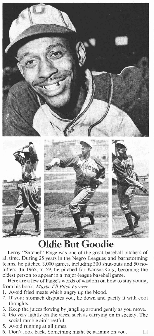 And the other is the best advice you’ll ever get in your life, from Leroy “Satchel” Paige, a pitcher who played until 59 years old both in the Negro Leagues and for Major League Baseball: